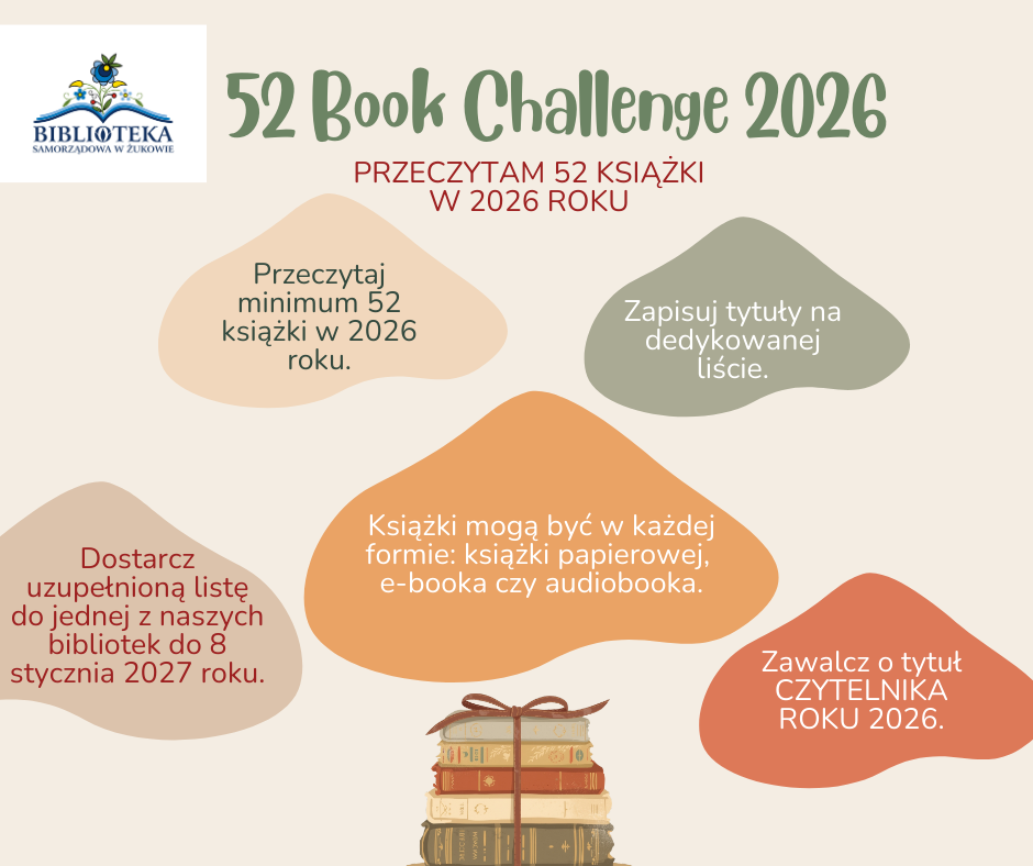 Zapisujcie tytuły przeczytanych książek na liście (pobierzecie ją poniżej), a uzupełnioną listę dostarczcie do jednej z naszych bibliotek do 8 stycznia 2027 roku (lub mailowo: promocja@bibliotekazukowo.pl).