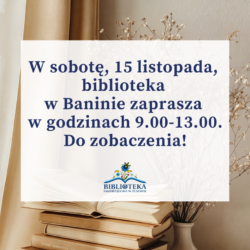 W sobotę, 15 listopada, biblioteka w Baninie zaprasza w godzinach 9.00-13.00. Do zobaczenia!