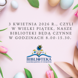 Uprzejmie informujemy, że 3 kwietnia 2026 r., czyli w Wielki Piątek, nasze biblioteki będą czynne w godzinach 8.00-15.30, zaś filia w Leźnie będzie nieczynna.