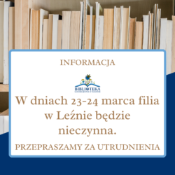 Informujemy, że w dniach 20-23 marca filia w Leźnie będzie nieczynna. Przepraszamy za utrudnienia.