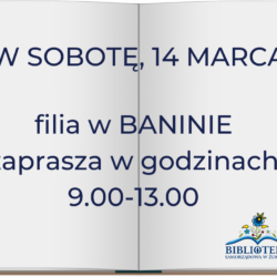 Zabrakło Wam lektury do sobotniej porannej kawy? A może dopiero w weekend macie czas, żeby bez pośpiechu i zerkania na zegarek pobuszować między naszymi regałami? Przypominamy wszystkim molom książkowym z Banina i okolic, że jutro (sobota, 14 marca) nasza filia w Baninie jest OTWARTA! Zapraszamy w godzinach 9.00-13.00. Czekamy na Was z uśmiechem, pachnącymi nowościami Read more about 14 marca filia w Baninie czynna 9-13[…]