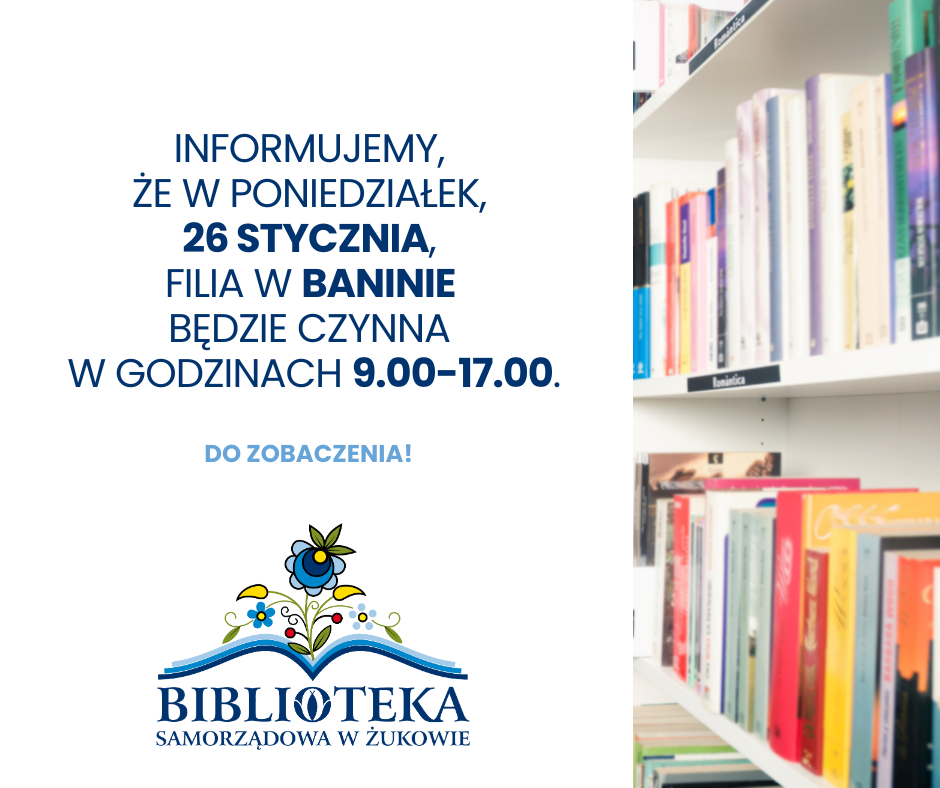 Banino, 25.01 Posted on 25 stycznia 2026 span> przez admin span> Drogie Czytelniczki, drodzy Czytelnicy, Informujemy, że w poniedziałek, 26 stycznia, filia w Baninie będzie czynna w godzinach 9.00-17.00. Do zobaczenia!