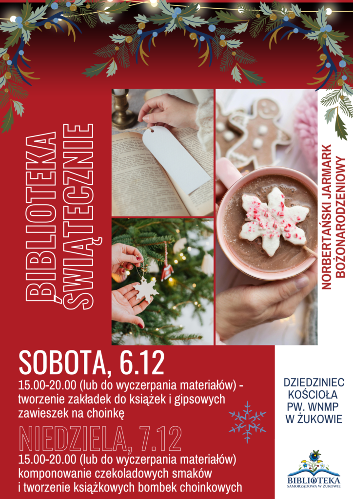 Serdecznie zapraszamy na NORBERTAŃSKI JARMARK BOŻONARODZENIOWY (dziedziniec kościoła pw. WNMP w Żukowie), podczas którego bibliotekarki Biblioteki Samorządowej w Żukowie będą prowadziły warsztaty:
