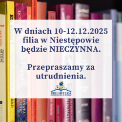 Drogie Czytelniczki, drodzy Czytelnicy, informujemy, że w dniach 10-12.12.2025 filia w Niestępowie będzie NIECZYNNA. Przepraszamy za utrudnienia.