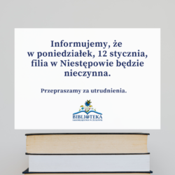 Drogie Czytelniczki, drodzy Czytelnicy, informujemy, że w poniedziałek, 12 stycznia, filia w Niestępowie będzie nieczynna. Przepraszamy za utrudnienia.