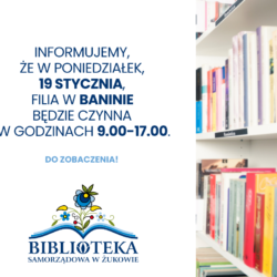 Drogie Czytelniczki, drodzy Czytelnicy, informujemy, że w poniedziałek, 19 stycznia, filia w Baninie będzie wyjątkowo czynna w godzinach 9.00-17.00.