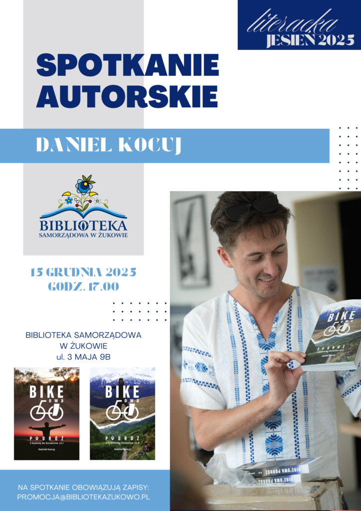 Zapraszamy na finał Literackiej Jesieni, którym będzie spotkanie z podróżnikiem Danielem Kocujem, autorem „Bike’owej podróży”. Tym razem widzimy się w poniedziałek, 15 grudnia o godz. 17.00 Kocuj zabierze uczestników w pełną przygód opowieść o podróży z Sydney do Szczecina. Będzie o kąpielach w Mekongu, najwyższych przełęczach świata i absurdach życia w drodze. Humor, pasja i autentyczność gwarantowane!