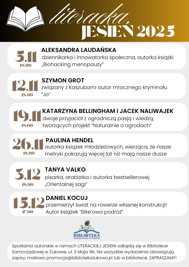 Wszystkie spotkania w ramach Literackiej Jesieni odbędą się w głównej siedzibie Biblioteki Samorządowej w Żukowie, ul. 3 Maja 9 b. Udział jest bezpłatny. Na spotkania obowiązują zapisy: promocja@bibliotekazukowo.pl lub w bibliotece. Po spotkaniach będzie można zakupić książki naszych gości, zamienić z nimi kilka słów i poprosić o autograf 🙂