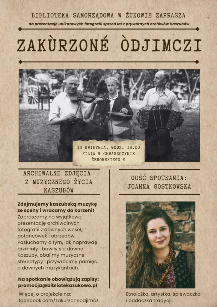 Tematem naszego spotkania będzie projekt „Zakùrzoné òdjimczi” (zakurzone zdjęcia). Joanna Gostkowska zaprezentuje unikatowe, archiwalne fotografie z prywatnych zbiorów Kaszubów. Przeniesiemy się na dawne wesela, potańcówki i rodzinne uroczystości, którym zawsze towarzyszyły żywa muzyka, śpiew i obrzędy.